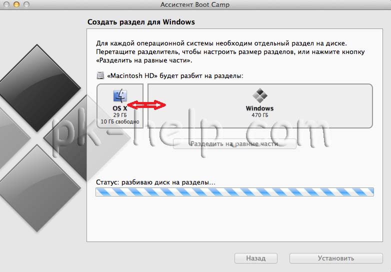 - Теперь вам нужно решить, сколько места вы хотите выделить для Windows 7. Возможно, вам удастся ограничиться всего 10 ГБ, но я бы настоятельно не советовал этого делать. У вас почти не останется места для установки программного обеспечения, а ваш файл подкачки в Windows может вызывать частые сбои. Я выбрал 20 ГБ, после установки Windows 7 у меня осталось чуть больше 16 ГБ.0002 Чтобы изменить количество места, выделяемого для Windows 7, щелкните небольшой разделитель между Mac OS X и Windows и перетащите его влево.