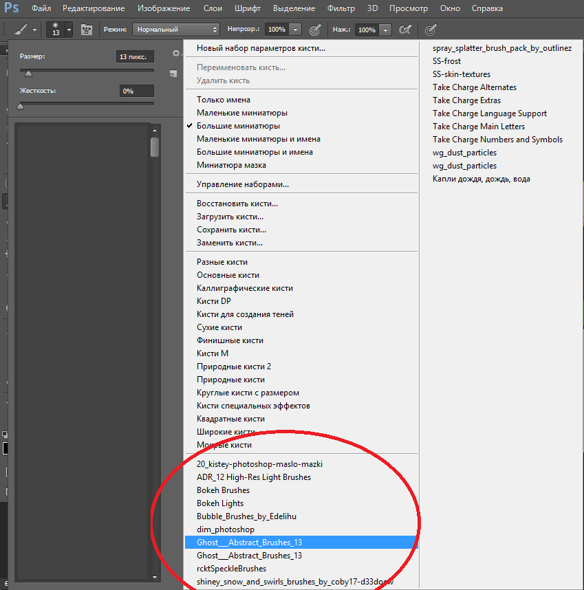 Выберите и укажите в проводнике путь в файлу с кистями. После этого опять необходимо выбрать «Загрузить». Дополнительный набор кистей отобразится у вас в нижней части списка.