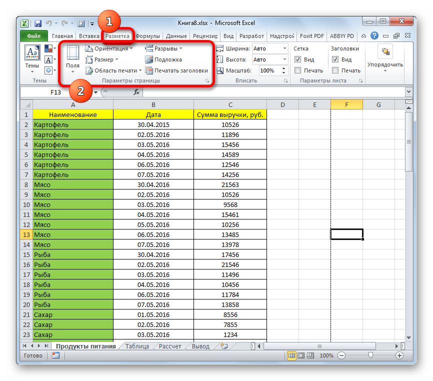 Существует и альтернативный вариант настроек печати. Его можно осуществить, перейдя во вкладку «Разметка страницы». Элементы управления отображением печати размещены в блоке инструментов «Параметры страницы». Как видим, они практически те же, что и во вкладке «Файл» и управляются по таким же принципам.