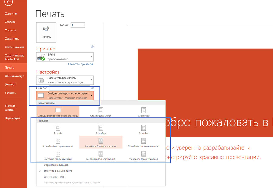 Как распечатать заметки к презентации в Windows