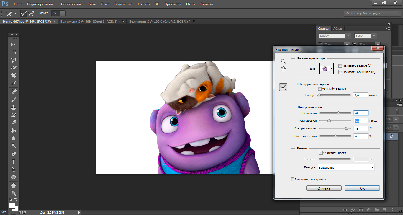 - В открывшемся окне можно сдвинуть линию выделения в сторону объекта и сгладить, поскольку в процессе выполнения задачи могли быть захвачены части фона. Применяем необходимые настройки.