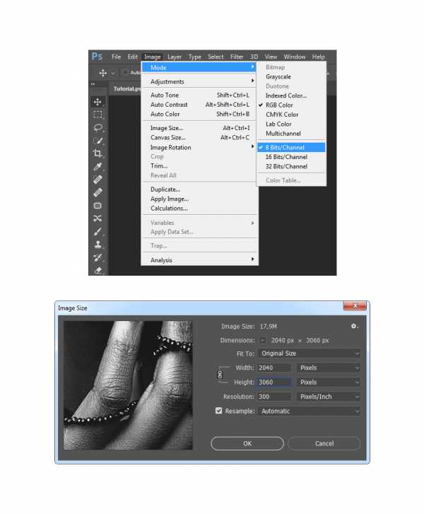 (бит/канал). Чтобы проверить, перейдите в меню Image – Mode (Изображение – Режим). - Для получения качественного результата, размер картинки лучше брать в пределах 2000-3500 пикселей в ширину/высоту. Чтобы проверить, переходим Image – Image Size (Изображение – Размер изображения).