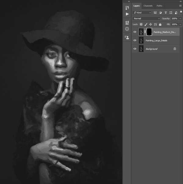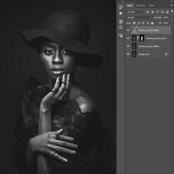 Теперь выбираем черный цвет (#000000), активируем Brush Tool (B) (Кисть), выбираем мягкую кисточку и проводим по тем областям, на которых хотите сохранить больше деталей.