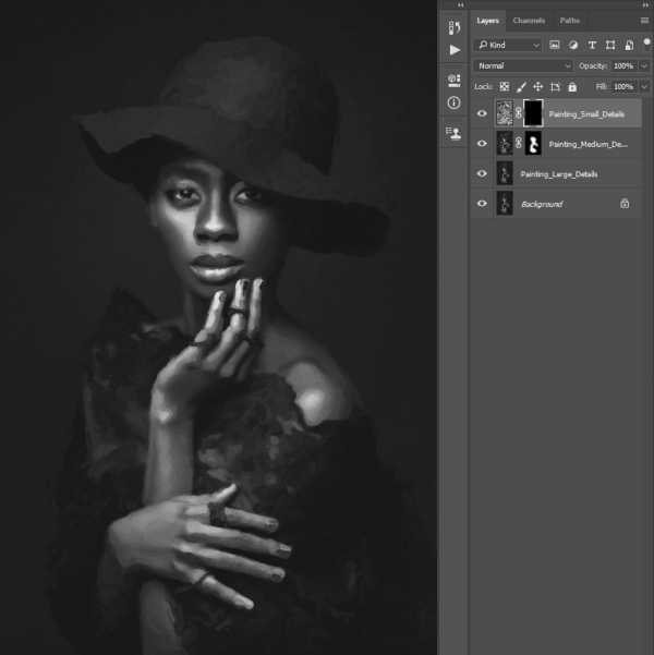 Также во время работы корректируйте диаметр кисточки, чтобы более тщательно проработать мелкие детали. Для быстрого изменения размера воспользуйтесь клавишами [ и ].