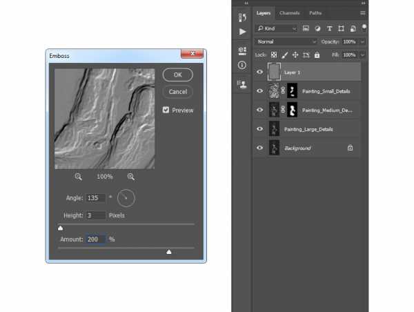 Переходим Filter – Stylize – Emboss (Фильтр – Стилизация – Тиснение). Устанавливаем Angle (Угол) на 135 градусов, Height (Высота) – на 3 пикселя и Amount (Эффект) – на 200%.