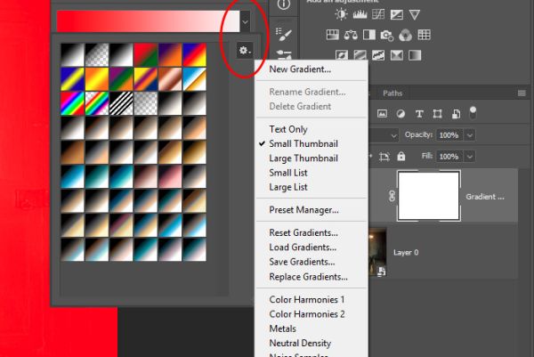Кликнув по круглой кнопке вы попадаете в меню панели градиента. Это стандартное меню, точно такое же есть и у кистей, стилей, контуров, фигур. Везде это меню делает одно и тоже. Позволяет создать и сохранить новый градиент. Переназвать, удалить. Вызвать Preset manager в котором можно больше всякого. Загрузить новые градиенты, или сохранить те что есть, очистить, вернуть к стандартным настройками и, конечно, загрузить готовые шаблонные коллекции градиентов Фотошопа, которые тоже не лишние.