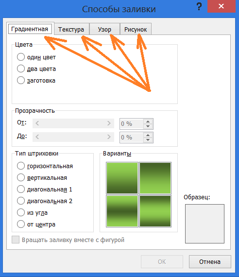 В диалоговом окне «Формат фигуры» во вкладке «Заливка» установите флажок «Градиентная заливка». В списке «Тип» выберите требуемый тип градиента, а в списке «Направление» — направление для градиента.