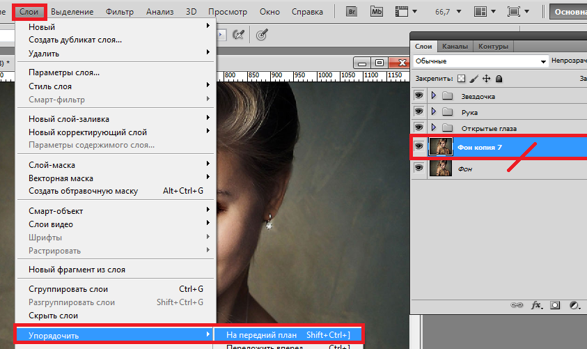 2. В разделе «Слои» перемещаем слой вниз, где располагается значок нового слоя.