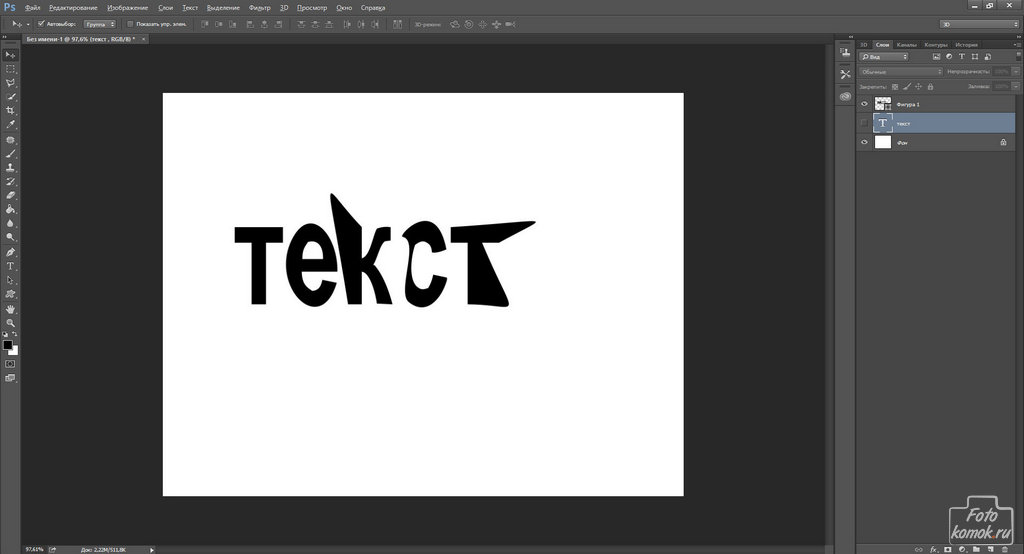 Теперь в верхнем меню выбираем «Редактирование» — «Трансформирование» — «Искажение» и настраиваем размер текста таким образом, чтобы буквы выглядели объемными.