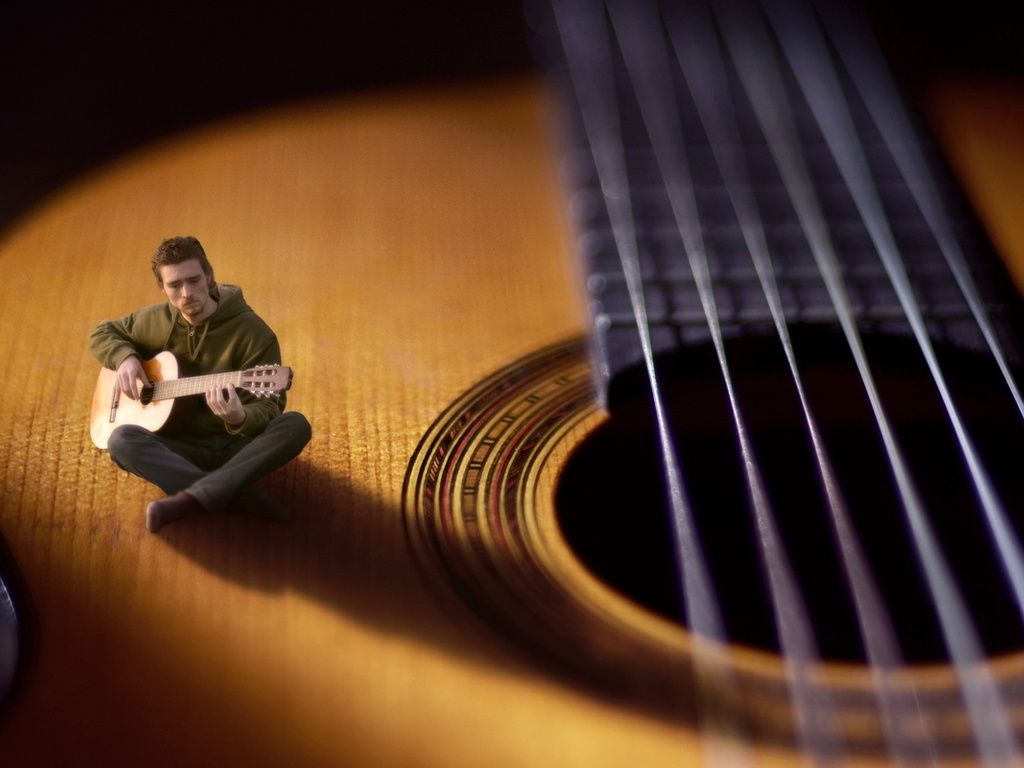 Субъект держит гитару, поэтому мы понимаем, что он музыкант, но изображение на самом деле не о музыке, а о человеке. Интеллектуально мы понимаем, как бы звучала эта гитара, если бы он на ней играл, но поскольку он на ней не играет, у нас действительно нет причин думать конкретно о звуке. Теперь давайте посмотрим на другой пример:На этом изображении музыкант играет на гитаре. Это хорошее фото, но хотя мы можем представить звук игры на гитаре, в этой сцене нет эмоций. Музыка — это эмоциональный опыт, а это значит, что нам нужно увидеть эту эмоцию, прежде чем мы действительно сможем совершить скачок от звука к музыке. Таким образом, выражение лица музыканта может сказать нам о многом — если в его выражении нет эмоций, мы можем так же легко представить, что он просто настраивает гитару или играет несколько отдельных аккордов, а не играет настоящую песню.
