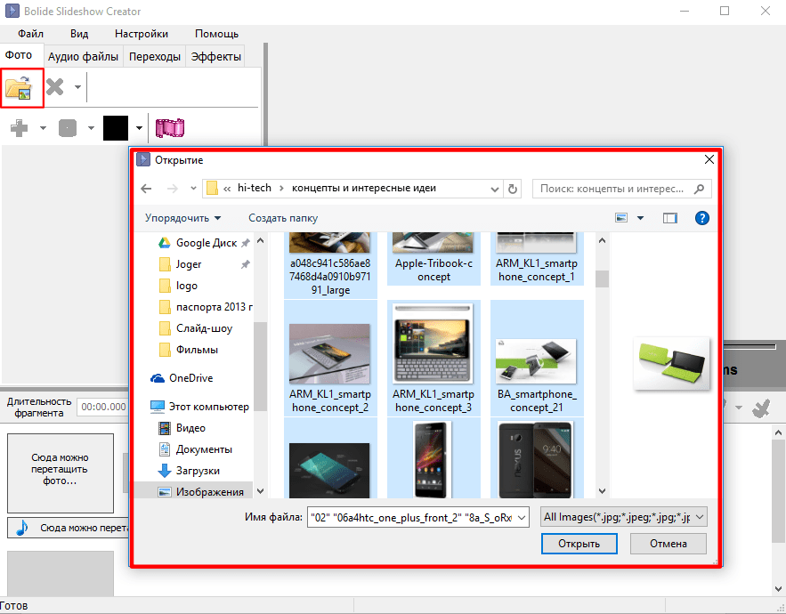 Далее необходимо открыть папку с файлами на вашем устройстве. Выбрать те снимки и записи, которых хотите добавить в видеоролик. Потом берется музыка для слайдов и проделываются аналогичные манипуляции. Так происходит до момента, пока все ваши файлы не будут загружены на сайт.