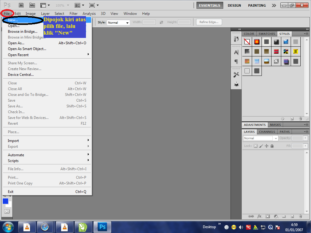 Шаг 1: Запустите Adobe Photoshop CS5, нажмите «Файл» в верхней части окна, затем нажмите «Создать». Это откроет новое окно.