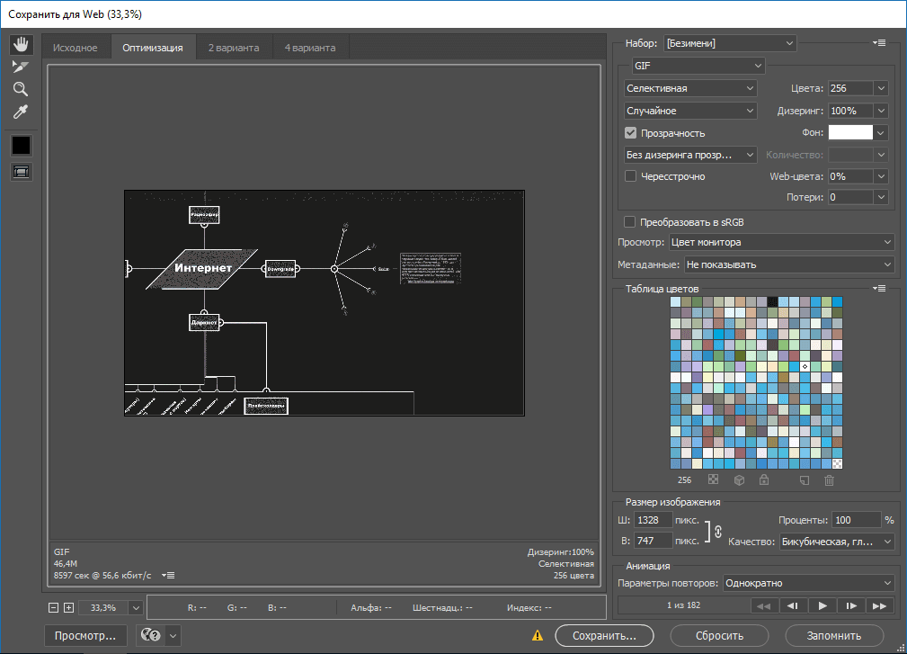 Теперь сохраняем так же, как и обычную гифку из фото: Для этого во вкладке «Файл» нажимаем «Экспортировать», далее выбираем «Сохранить для Web (старая версия)…». Откроется окно, в верхней части которого выбираем нужный формат – GIF. Внизу можно отредактировать количество цветов (чем больше, тем качественнее), исходный размер… Если сделать меньше (в процентном соотношении), то вес тоже уменьшится.