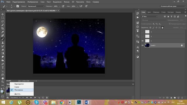 Для непрерывного показа кадров нам необходимо выбрать значение «Постоянно». Чуть ниже от того, где мы выбирали время воспроизведения для каждого слоя, есть окно выбора параметров цикла.