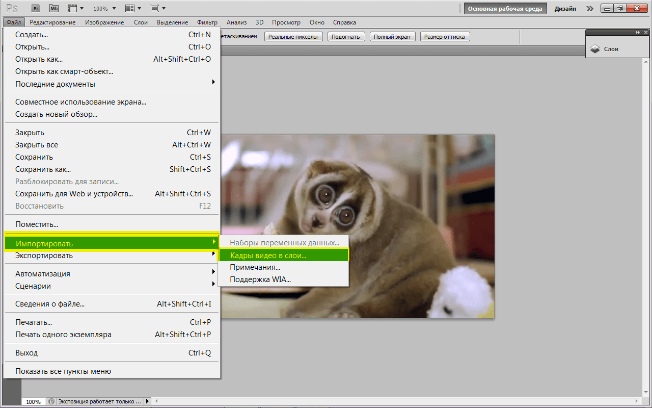Для импорта кадров из видео нажмите «Файл > Импортировать > Кадры видео в слои…» и выберите файл на компьютере.