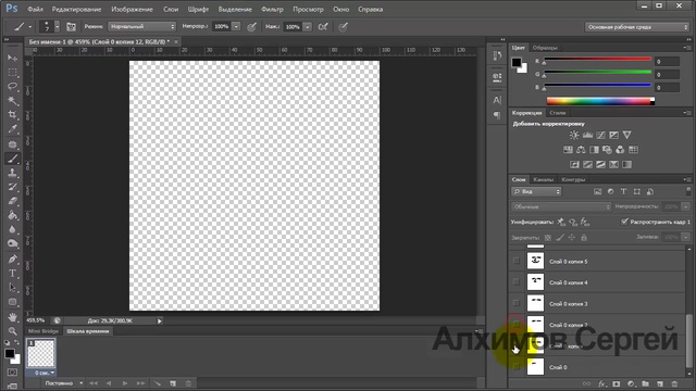 Создаем копии кадров в программе Photoshop CCДалее в окне Timeline (Шкала времени) выбираем первый кадр и в окне Layers (Window — Layers (Окно — Слои)) отключаем для кадра видимость всех слоев кроме фона.