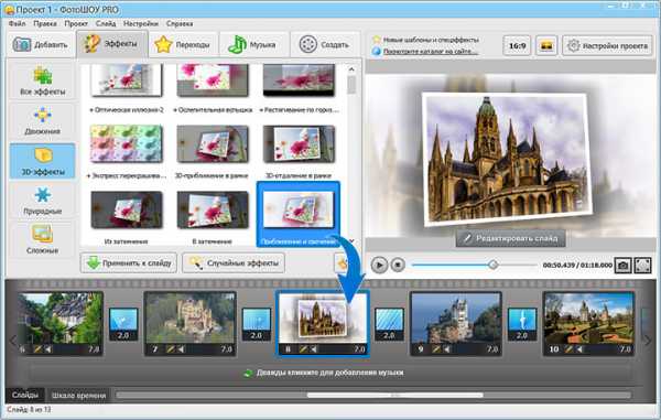 Перейдите на соответствующую вкладку в верхней части интерфейса. В левом столбце представлены доступные категории переходов. Для фильма рекомендуем вам использовать 3D эффекты, например, скручивание через правый край, или разворот по центральной оси. Очень интересно смотрятся переходы типа рассыпания на отдельные фрагменты. Щелкните раз один по квадратику между фото в рабочей ленте, и дважды по эффекту, чтобы применить.