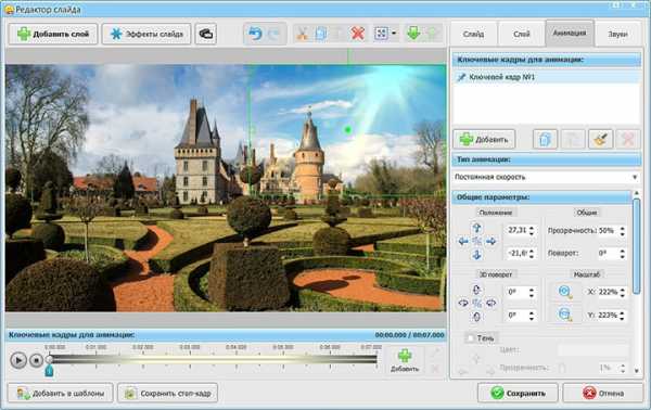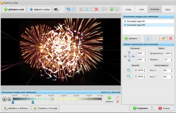Ключевым этапом создания видеоролика из фото является редактирование изображений, превращение их из статичных картинок в полноценные кадры. Нажмите на изображение карандаша под фото или на иконку «Редактировать слайд» в правом окне предпросмотра. Через иконку «+» в левом верхнем углу вы получаете доступ ко всем элементам оформления. Для примера используем эффект снегопада. Щелкните по одноименному пункту, и анимация автоматически применится к фото. Далее «Сохранить».