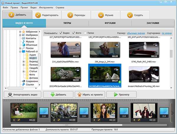 Перенесите необходимые файлы в нужном порядке в область монтажа. В режиме «Шкала времени», выделяя каждый файл, настройте длительность его отображения в будущем видеоролике.