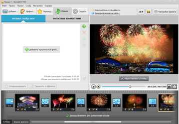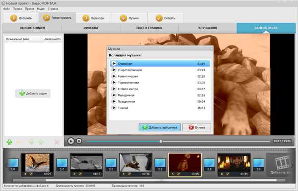 Подробную информацию о данной функции подчерпните из статьи: «Как озвучить видео в домашних условиях». Ключевые моменты здесь следующие: нажмите вкладку «Музыка», далее вы можете добавить музыкальный файл или из коллекции утилиты, или из памяти компьютера, а также наложить голосовые комментарии. Через соответствующую иконку на музыку устанавливается громкость и применяются эффекты, а также делается синхронизация с видеорядом.