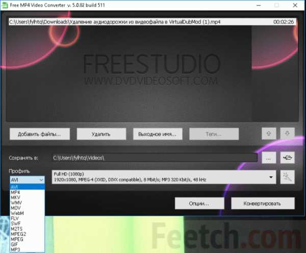 В этих целях можно применять также бесплатную утилиту Free MP4 Video Converter. Несмотря на столь специализированное название интерфейс поддерживает преобразование к большинству имеющихся на сегодняшний день форматов. В том числе, и AVI, воспринимаемый напрямую VirtualDubMod. В паре эти инструменты позволят создать видео нужного формата и наложить на него несколько дорожек сопровождения. В большинстве случаев этого вполне достаточно.