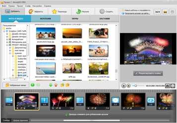 Добавление изображений для фильма в утилиту осуществляется через одноименную вкладку. Перетащите фото в нижнюю рабочую ленту, при необходимости – поменяйте их местами. На данном этапе вы делаете основу, каркас своего будущего фильма.