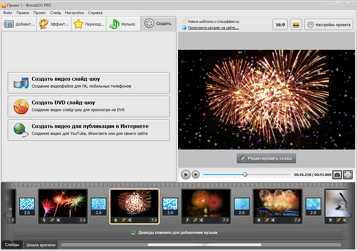 Создать видеоролик. Нажмите вкладку «Создать» в главном меню программы. Далее выберите нужный формат. Представленная программа отличается от всех остальных аналогов тем, что позволяет сделать качественные фильмы не только для компьютера, DVD, или мобильных устройств, но и публикации в интернете.
