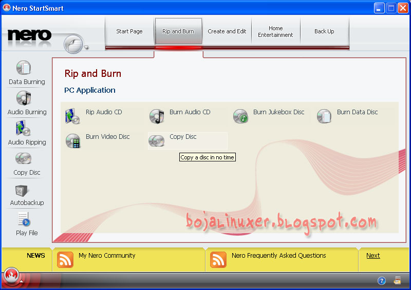 Для этого нужно выполнить следующее.1. Вставьте чистый диск в записывающий привод компьютера и запустите программу Nero StartSmart.2. Перейдите на вкладку Rip and Burn (Перенос и запись).3.