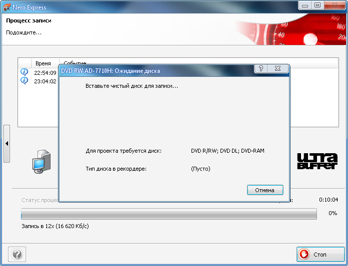Если в качестве привода-приемника используется жесткий диск компьютера, то по окончании процесса автоматически откроется привод, в котором находится источник копирования, и программа предложит вставить туда чистый компакт-диск. Выполните требование программы и закройте привод. После того как программа обнаружит в приводе чистый диск, запись начнется автоматически. В окне программы отображается ход записи и указывается затраченное на данную операцию время.
