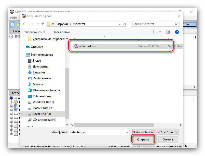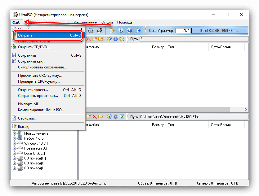- Запустите программу, в главном окне нажмите Файл — Открыть и выберите нужный образ, хранящийся на жёстком диске.