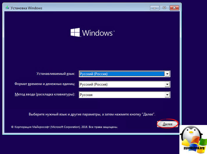 - После этого компьютер перезагрузится и запустится уже с того загрузочного носителя, на котором установлен дистрибутив Виндовс. Прежде всего, откроется окно, где нужно выбрать язык, раскладку клавиатуры и формат времени. Установите оптимальные для себя параметры и жмите «Далее» .