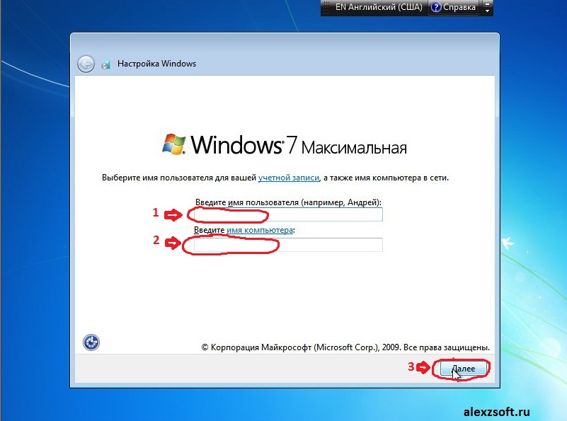 Запустите систему с установочного диска Windows 7, укажите страну и язык и нажмите кнопку Далее.