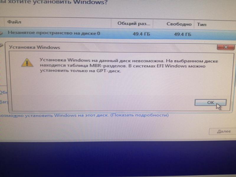 Windows 7 будет устанавливаться только на диск / раздел с таблицей разделов MBR (Master Boot Record)