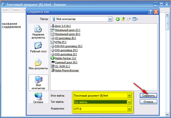 Откройте файл блокнота, нажмите «Сохранить как», введите имя файла и добавьте html в конце. Затем в раскрывающемся меню измените «Текстовые документы» на «Все файлы» (кодировка должна быть UTF-8, если она есть в качестве опции в правом нижнем углу). Затем нажмите «Сохранить!».