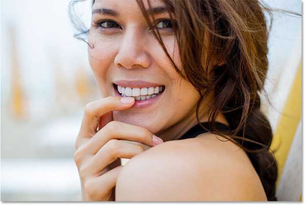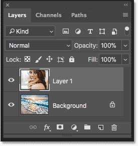 Если мы посмотрим на панель слоев, то увидим, что два изображения размещены на отдельных слоях. Изображение с пляжем – на слое заднего фона, а портрет девушки – на «Слое 1» (Layer 1) над ним: