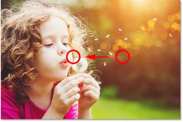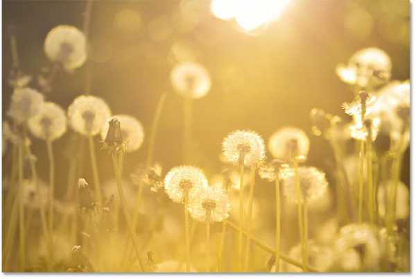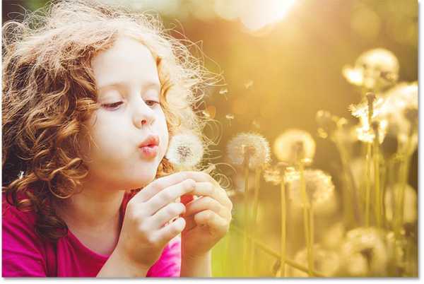 Когда вы отпустите кнопку мышки, программа Photoshop нарисует градиент на маске слоя и совместит два изображения вместе. Итак, нам стала видна девушка с верхнего изображения и одуванчики – с нижнего. Если вам не понравился результат, просто протяните по маске еще один градиент: