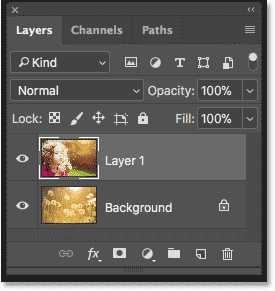 И снова, если мы посмотрим на панель слоев, то увидим, что каждое изображение размещено на отдельном слое. Фотография одуванчика – на слое заднего фона, а изображение с девушкой – на «Слое 1» (Layer 1) над ним: