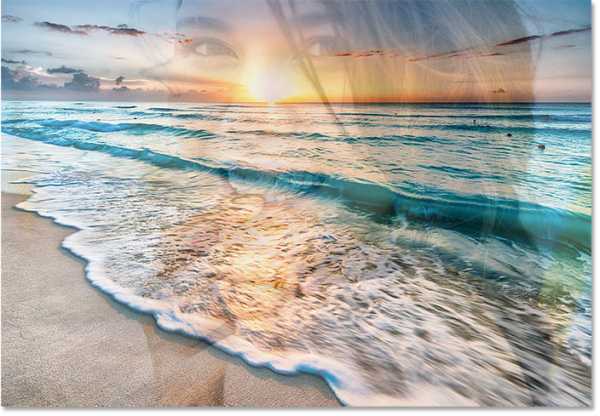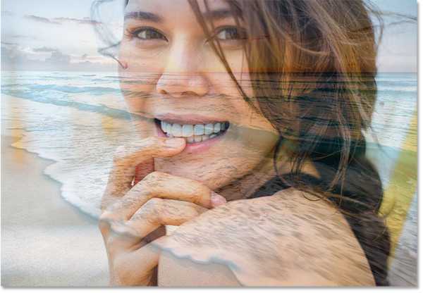 Это означает, что теперь 75% верхнего изображения смешалось с 25% нижележащего изображения. В нашем случае видно, что изображение с девушкой стало совмещаться с изображением с пляжем.