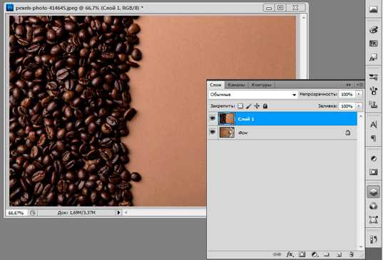 Опция «Непрозрачность» (Opacity) расположена в правой верхней части панели слоев. По умолчанию, непрозрачность слоя равна 100%. Это означает, что активный выбранный слой («Слой 1» в нашем случае) полностью закрывает нижележащий слой.