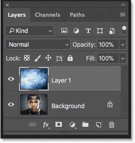 И снова, если мы посмотрим на панель слоев, то увидим, что каждое изображение расположено на отдельном слое. Портрет размещен на слое заднего фона, а текстура – на слое над ним: