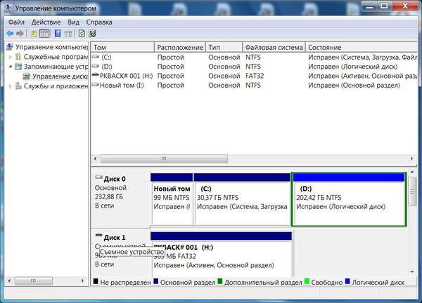 В окне «Управление дисками» отображаются диски и тома в графическом представлении или представлении списка.