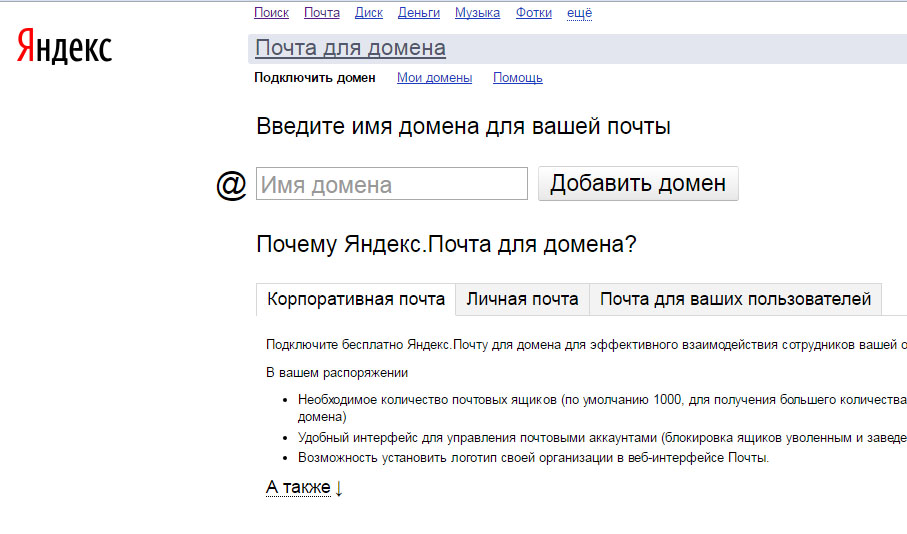 Для того, чтобы подключить доменную (корпоративную) почту потребуется, посетить сайт connect.yandex.ru.