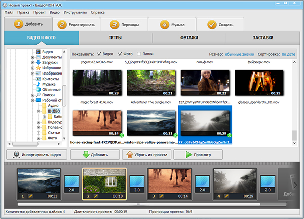 Нажмите кнопку Добавить файлы и выберите фотографии и видеофайлы, которые будете использовать для создания слайд-шоу. Выбранные файлы появятся на Шкале времени в нижней части окна программы.