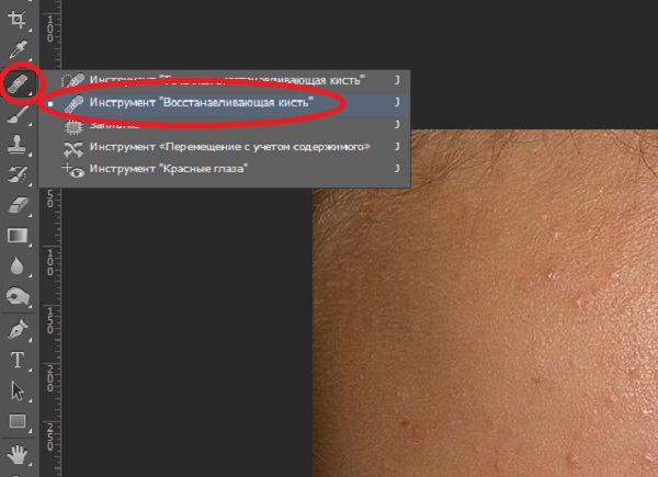 - Выберите инструмент «Восстанавливающая кисть» в той же группе. Но если вы попытаетесь точечно замазывать прыщи, как и в первом случае, то вам выскочит ошибка. Дело в том, что для закрашивания прыща этому инструменту нужна область донора, чтобы было на кого равняться.