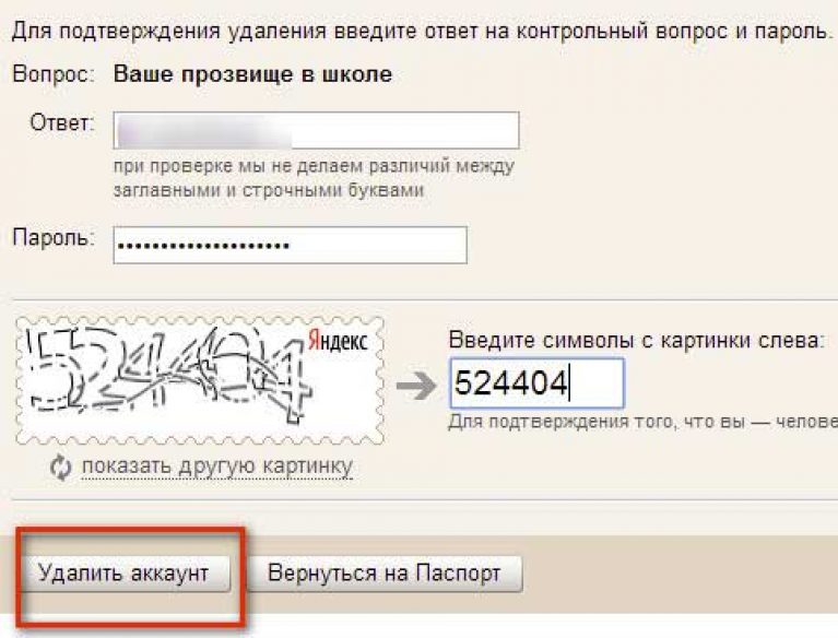 - Свершилось, мы на последнем этапе! Тут система предупреждает вас о том, что вместе с аккаунтом будут удалены сервисы, которыми вы пользуетесь. Например, это могут быть Яндекс.Деньги, файлы, залитые на сервис самого крупного поисковика России и т.д.. Именно поэтому не рекомендуется удалять аккаунт целиком. Впрочем, это вы решаете сами. На этой странице необходимо ввести пароль, капчу и ответ на секретный вопрос. И вот тут начинается самое интересное, поскольку по статистике более 80% пользователей этот ответ не помнят совершенно! А без него удаление ящика невозможно… Насколько нам известно, восстановить ответ на секретный вопрос нельзя, поскольку он необходим даже при замене самого ответа. Получается палка о двух концах. Однако если вы знаете ответ, то вам повезло. Вводите данные на странице и нажимаете кнопку «Удалить аккаунт».