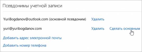 В разделе «Псевдонимы учетной записи» установите флажок Сделать основным напротив адреса, который вы хотите сделать основным.