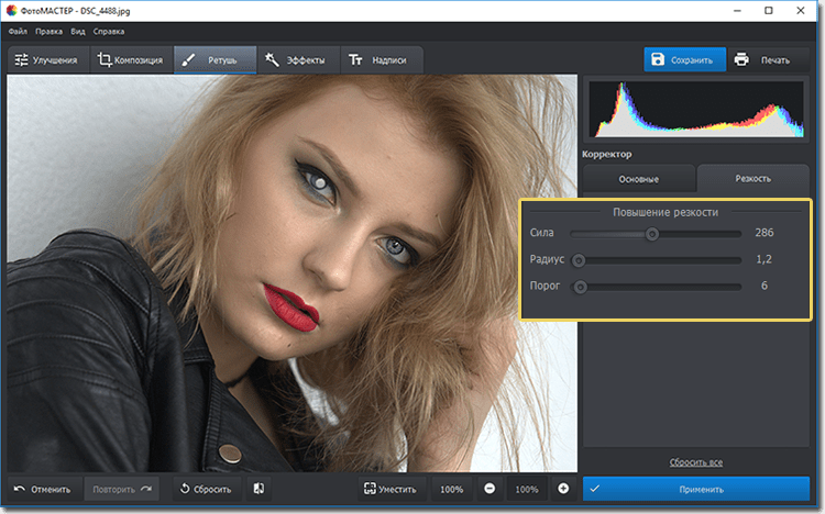 Самый известный способ увеличения резкости — фильтр Unsharp Mask. Он позволяет управлять увеличением резкости с помощью трех параметров: