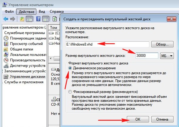 Она означает – создать файл win7.vhd расширяемого типа, максимальный размер ограничить 30 Гигабайтами. Замените E: на имя диска, на котором вы хотите хранить создаваемый файл.