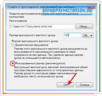 Данная команда создает файл .VHD на диске С: с именем Win7.vhd (диск, папка расположения и имя файла зависят только от вашей системы и фантазии), максимальный размер будущего виртуального диска определен как 30ГБ, при этом тип .VHD определен как «фиксированного размера», т.е. файл изначально будет занимать 30ГБ на «родительской» файловой системе.