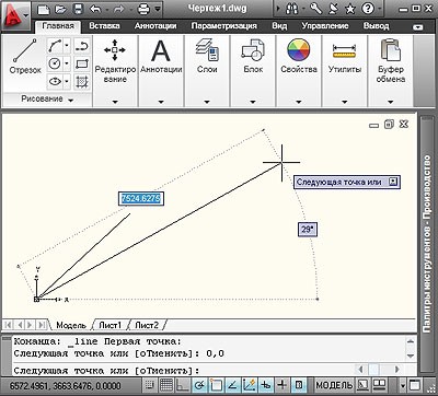 Режим динамического ввода включается клавишей F12, после чего возле курсора появляются два прямоугольных окошка (зависит от режима). Переключаться между ними можно нажатием клавиши Tab. В правом вводятся координаты Y, а в левом X. Для второй же точки уже появится поле для расстояния и поле для угла. Введите длину отрезка, нажмите Tab, задайте угол и щёлкните Enter. После этого завершится построение отрезка.